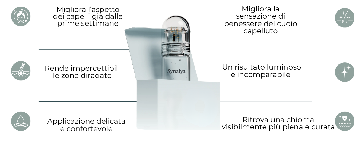 Capelli dall’aspetto visibilmente più denso e curato con l’uso regolare. Synalya è stata progettata per migliorare l’aspetto del cuoio capelluto e dei capelli grazie a una tecnologia cosmetica avanzata di micro-infusione.